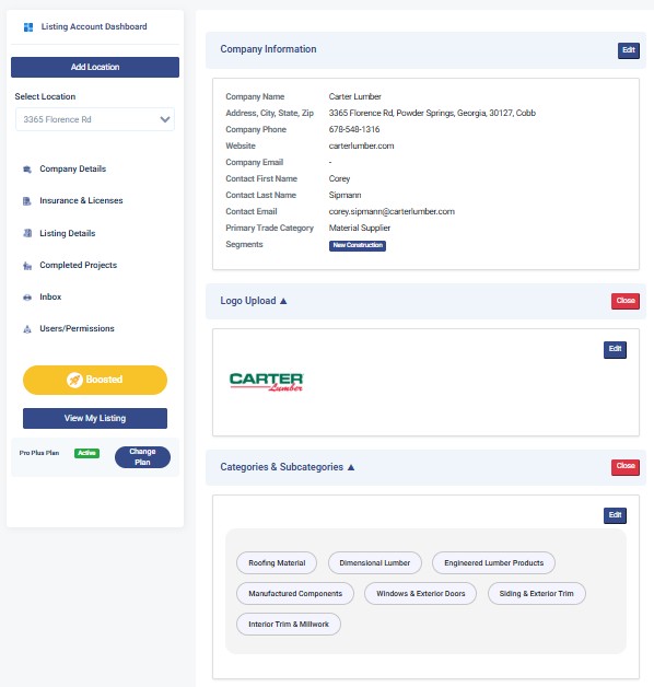 Your Pro Listing puts you in front of the best builders ready to hire. When they search for specific criteria that match yours, you will appear at the top of their list, making you a top candidate for hire! Your Listing Details page showcases your company's value and gets builders & remodelers to select you for their next project.